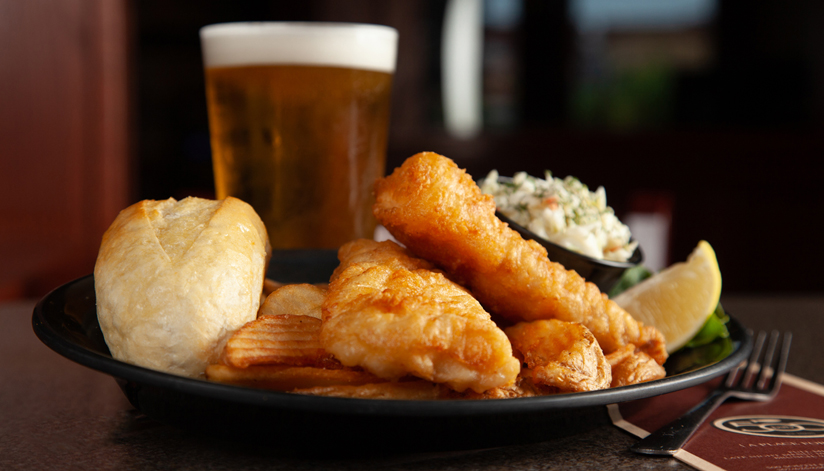 A Pub specialty—two beer battered cod loins served on a mound of fries (the English call them chips), coleslaw, and a freshly baked bacon cheddar biscuit. 19.99